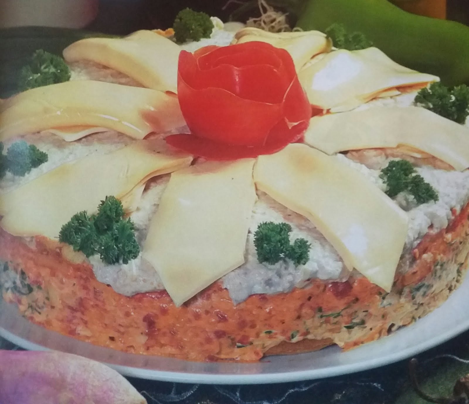 Na isti nacin pripremimo i drugu koru. Mikserom izmutimo puter,dodamo pavlaku,izdrobljene orahe i sitno secen beli luk. Mutimo dok se sastojci ne sjedine. Zatim u sud krupno izrendamo kackavalj ,dodamo majonez i promesamo. U treci sud dodamo sitno secen persun i promesamo. Skuvanim jajima odvoimo nelanca od zumqnca. Zumanca izgnjecimo viljuskom,dodamo u cetvrti sud i promesamo. Na tacnu stavimo prvu koru i premazemo filom sa zumancima.Zatim naneseno fil sa persunom. Na njega namesemo fil sa ajvarom. Na filove stavimo drugu koru koju premazemo filom od rena. Parcad tost kackavalja uvijemo u rolne i nanesemo na tortu. Izmedju rolni stavimo grancice francuskog persuna. Dekoraciju zavrsimo cvetom od ljuske paradajza na sredini torte.